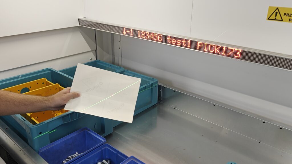 Aby operator nie tracił czasu na szukanie konkretnej przegrody, stosujemy laserowe wskaźniki (Laser Pointer) oraz listwy alfanumeryczne. Światło dokładnie pokazuje: „pobierz stąd 3 sztuki”. To eliminuje pomyłki i ogromnie przyspiesza pracę w stresujących momentach. - Reorganizacja składowania